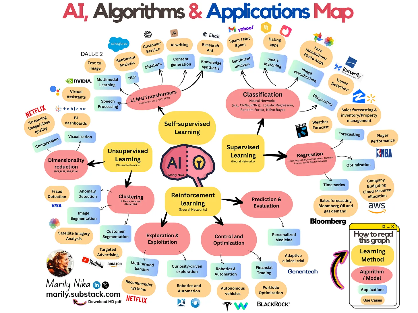 On va s’intéresser dans ce cours à l’apprentissage automatique dit “classique”1 qui regroupe des algorithmes très simples nés dans les années 50 et toujours utilisés aujourd’hui à peu près partout.